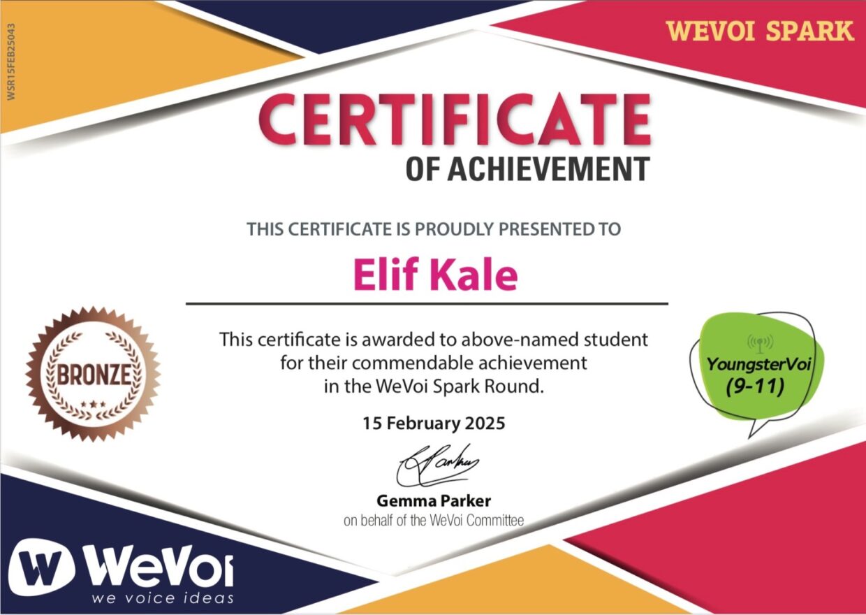Ortaokul öğrencilerimiz, uluslararası WeVoi İngilizce hitabet yarışmasında önemli bir başarı elde etti. Deniz Özer, Kira Drozdik, Zümra Tan ve Elif Kale, kendi hazırladıkları videolarla gümüş ve bronz sertifikalar kazandılar. Öğrencilerimiz, içerik oluşturma, İngilizce dil kullanımı, telaffuz, sunum teknikleri ve kendini ifade etme gibi kriterlerde başarılı oldular. Öğrencilerimizi ve emeği geçen öğretmenlerimizi tebrik ederiz.