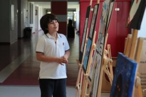 2. sınıf öğrencimiz Ege Köse, uzay temalı kişisel resim sergisini okulumuzda açtı. Ege, hayal gücüyle yıldızları, gezegenleri ve galaksileri kendi renkli dünyasında yeniden yorumladı. Astronotlardan uzay gemilerine, bilinmeyen gezegenlerden dost canlısı uzaylılara kadar birçok öğe, Ege’nin özgün çizgileriyle hayat buldu. Merak, keşif ve hayal gücüyle dolu bu etkileyici sergi; Ege’nin yaratıcı bakış açısını ve detaylara verdiği önemi gözler önüne seriyor. Minik sanatçımızı bu ilham verici sergisi için tebrik ediyor, gökyüzü kadar sınırsız bir sanat yolculuğu diliyoruz.